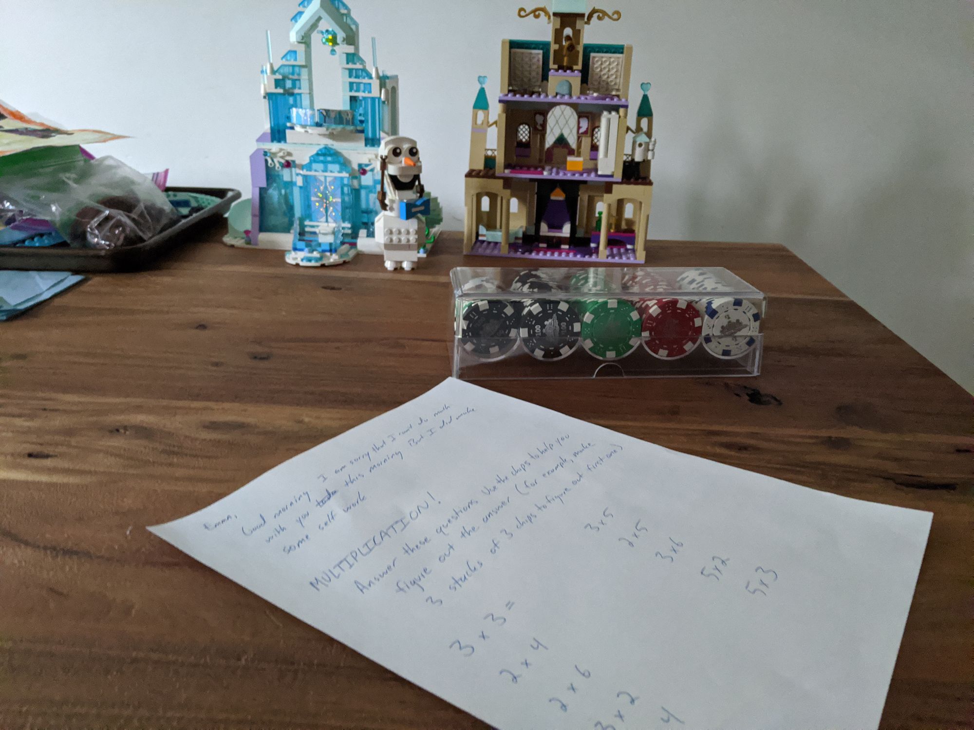 A typical school day looks like this: I do math with Emma for an hour before I start work. This gives Rachel predictable time each morning to herself. Some mornings Emma and I work through the Moving Beyond the Page curriculum. Some mornings we play games that we've invented, like "Double Dice Gym" where we take turns rolling the dice, adding the numbers, multiplying by two, and doing that many reps.