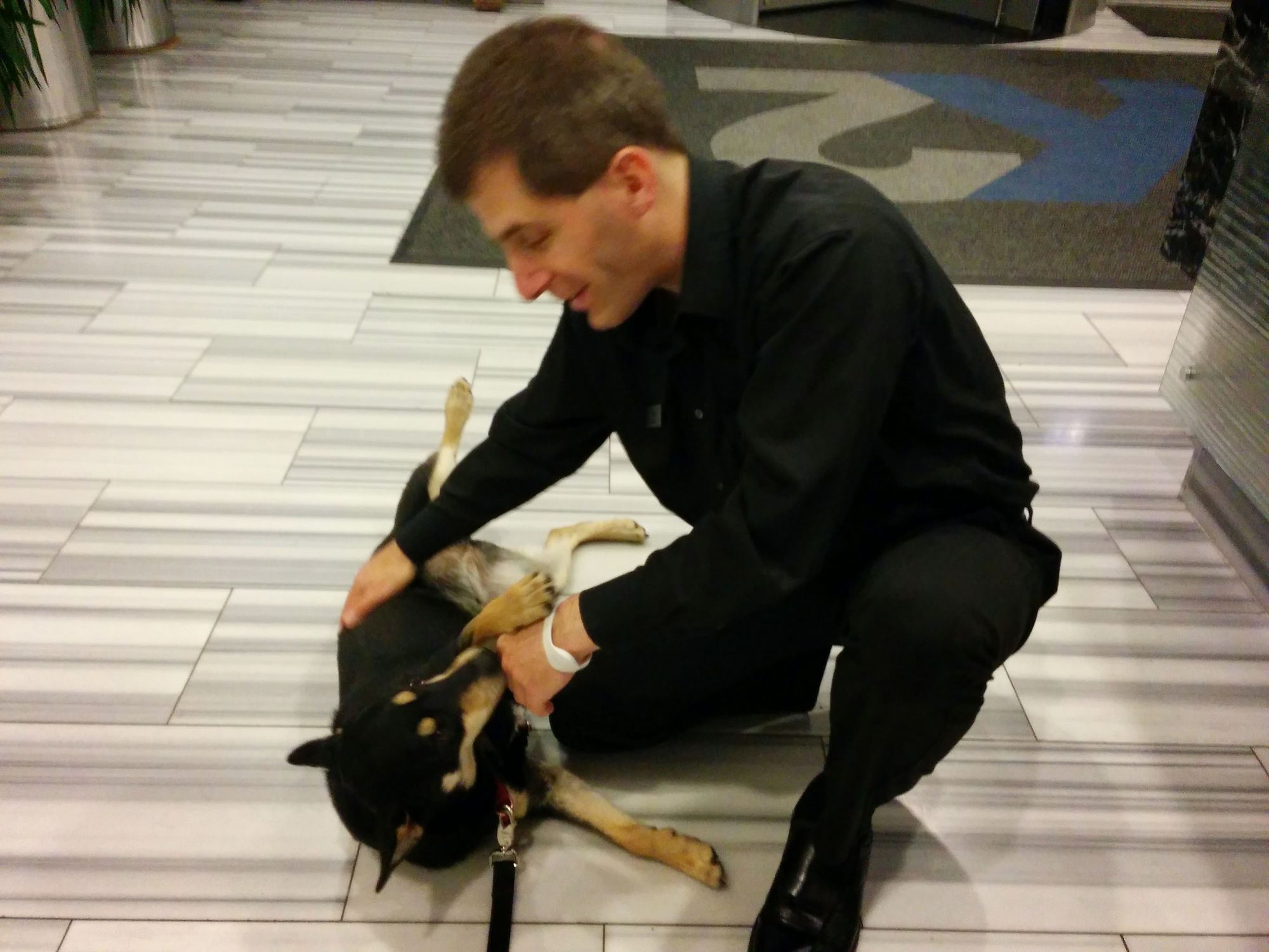 Eugene happened to visit on a day when Kaira was at doggy day care, so we walked down to get her together. She remembered him.