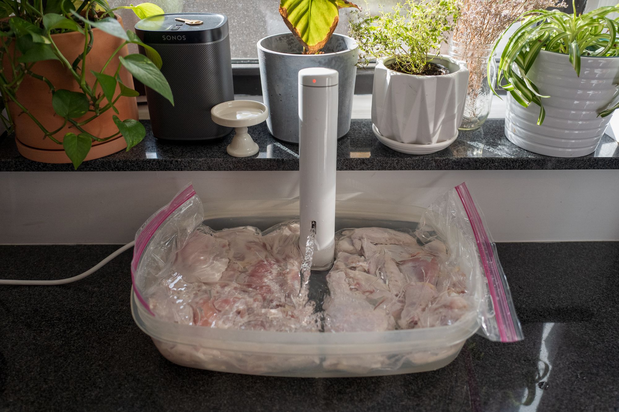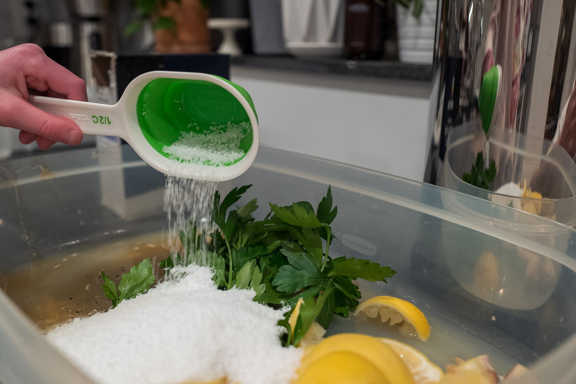 With all due respect to TK, the last two Thanksgivings, I've experimented with sous viding the chicken before dropping it in the oil. The idea is to pre-cook the chicken most of the way, and then finish it off in the fryer. This year I took it to 145, which I think was too high. The brine saved the day -- the chicken didn't taste overcooked -- but it wasn't as juicy as in years past. Next year I think I'll go 125-130, and trust the oil to bring it the rest of the way.