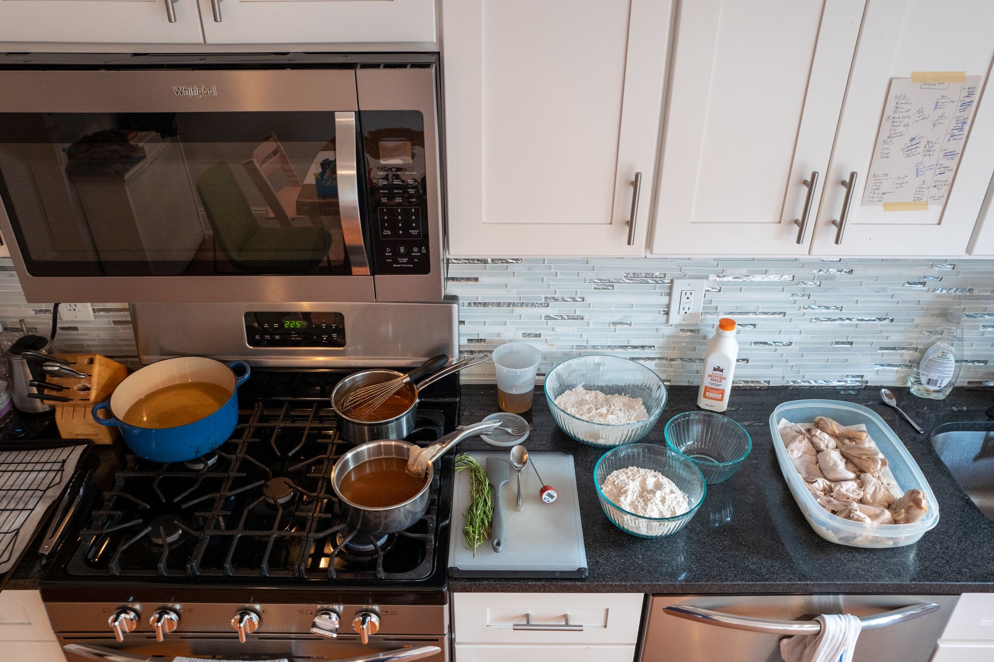 There's a few challenges with the process of frying raw chicken while your kitchen is full of guests: