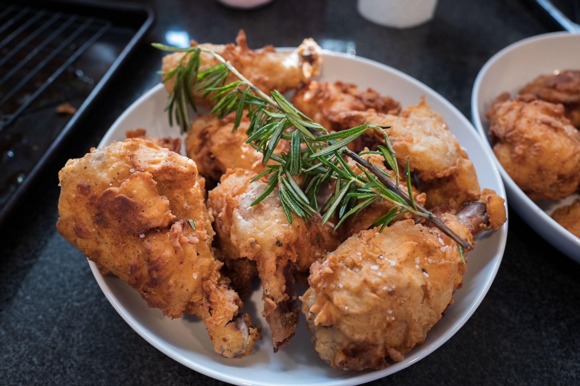 It's a buttermilk fried chicken with a breading that's flavored with garlic powder, onion powder, cayenne, and paprika. The recipe calls for soaking the chicken overnight in a lemon-honey brine. We typically buy two whole chickens, break them down the night before, and use the bones to make stock and gravy.